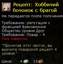 - Повара могут купить у фракции рецепты и изготавливать по ним предметы, которые обмениваются на репутацию.